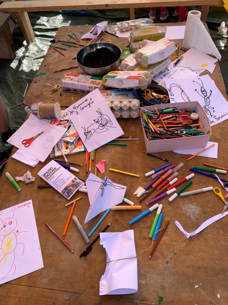 Nel pomeriggio, complice un sole quasi estivo, si sono alternate letture animate, giochi con la terra e materiale di riciclo, piccoli laboratori con strumenti musicali, colori, gessetti e molto altro per stare insieme, animare e dare una ventata di primavera ad un luogo che ormai è in evidente stato d’abbandono e in mano allo spaccio.